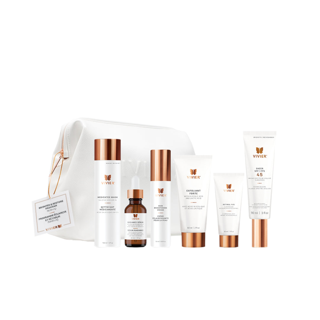 Ce programme d’éclaircissement et de rétablissement comprend une routine complète de produits conçus pour améliorer l’apparence des taches pigmentaires, des ridules, de la texture irrégulière et du teint inégal, tout en protégeant contre les dommages futurs et en retrouvant un éclat naturel et sain sans l’utilisation d’hydroquinone.